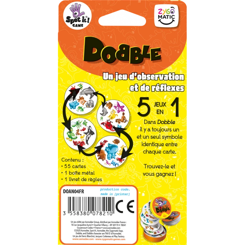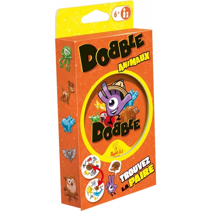 Repérez plus vite que vos adversaires l’animal en commun entre deux cartes. Dobble Animaux, le succès du jeu de réflexes et d’observation, s’allie au thème animalier, pour le plaisir des jeunes joueurs…et de tous les autres !