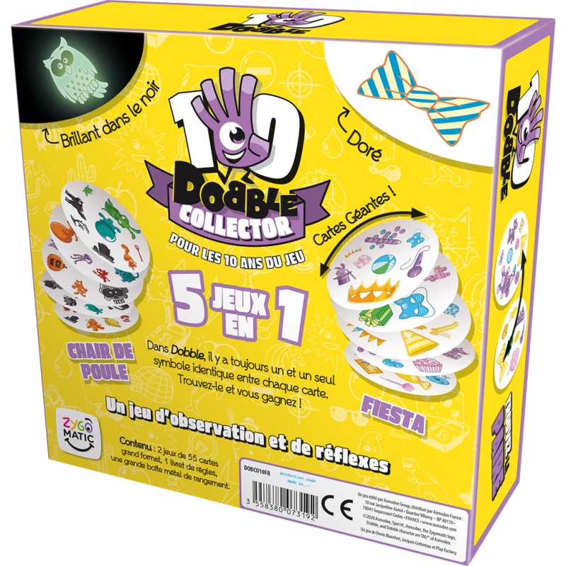 Pour marquer ce dixième anniversaire, nous vous proposons une édition exceptionnelle, dans une boîte géante. Il faut bien cela pour ranger les deux sets de cartes aux symboles et aux thèmes inédits ! Le « Chair de Poule » est un set de 55 cartes, qui brillent dans le noir ! Le set « Fiesta » est constitué de 55 cartes à effet doré, pour des parties de luxe !