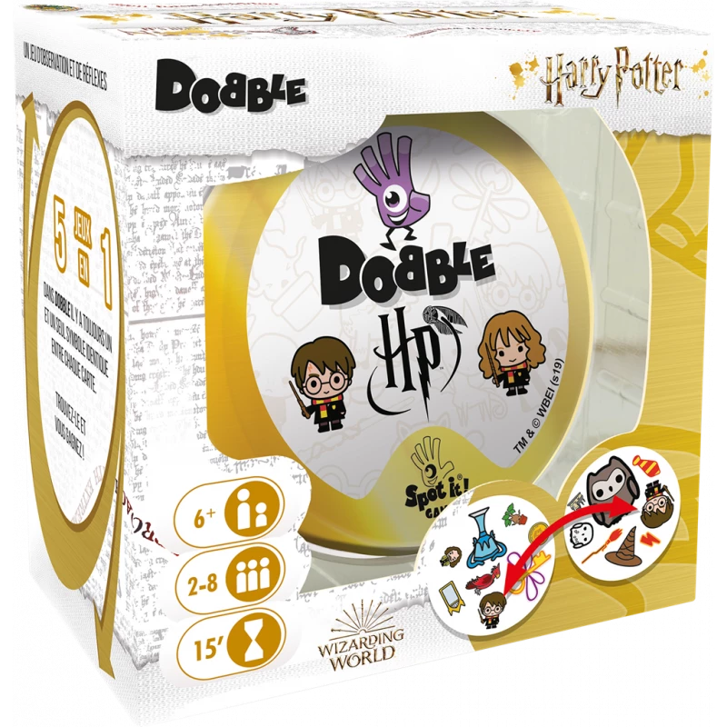 Tous les fans de Dobble et d’Harry Potter en ont rêvé, le voici, le Dobble Harry Potter ! Deux légendes se retrouvent dans cette petite boîte : Dobble, ses 55 cartes, ses 5 règles et son principe qui fédère toute la famille et les amis autour d’un moment convivial, et Harry Potter, la saga célèbre dans le monde entier !