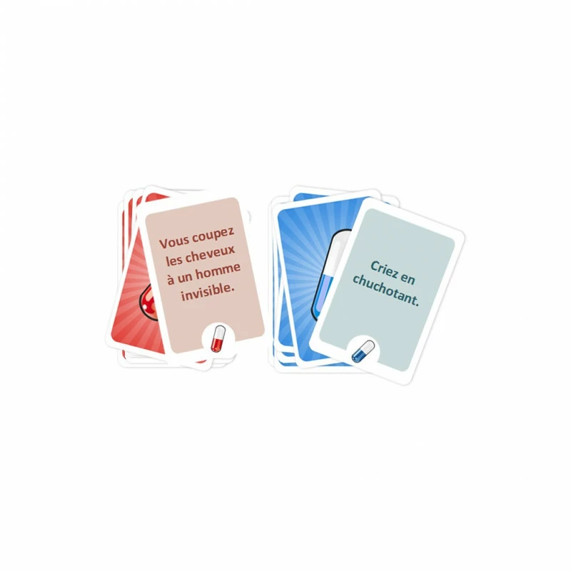 Soyez la première équipe à quitter l’établissement du Docteur Pilule. Vous et votre coéquipier devez vous évader de la clinique du docteur Pilule avant les autres équipes ! Pour cela, vous allez subir une batterie de tests psychologiques. Chaque test dure 40 secondes durant lesquelles vous devez faire deviner le maximum de mots à votre ami imaginaire. Mais attention, pendant ces tests, vous et votre coéquipier devez respecter les effets secondaires des pilules qui vous auront été administrées. Pour chaque mot trouvé, vous progressez d’une pièce au travers de la clinique du docteur Pilule.