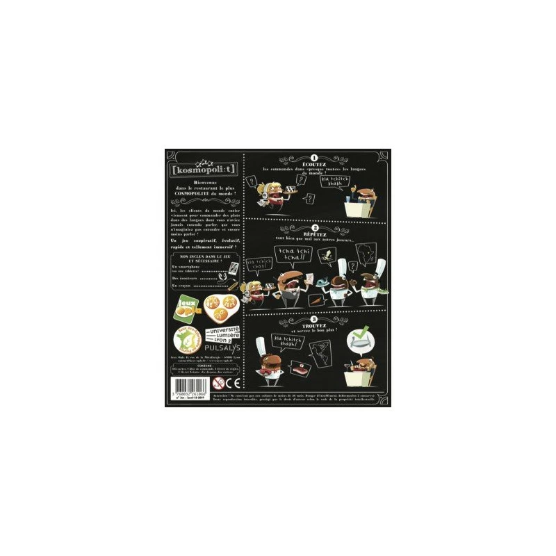 [Kosmopoli:t] est un jeu coopératif dans lequel les joueurs revivent tous ensemble l’atmosphère du service du soir d’un restaurant très … cosmopolite. Ici, les clients viennent du monde entier et chacun commande dans sa propre langue. Les plats commandés concernent des plats typiques de chaque pays, qu’il vous faudra déchiffrer correctement pour satisfaire les clients exigeants.