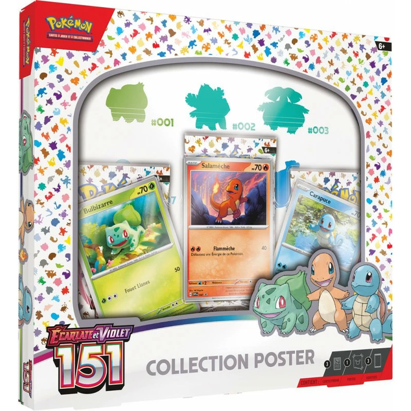 3 cartes promo brillantes de Bulbizarre, Salamèche ou Carapuce, les premiers partenaires, Pokémon de Kanto, 1 poster Écarlate et Violet – 151, 3 boosters Écarlate et Violet – 151 du JCC Pokémon, 1 carte à code pour le JCC Pokémon Live.