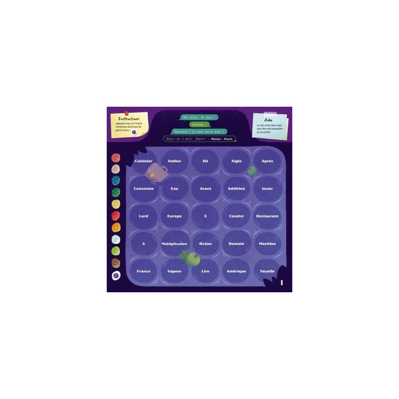 30 énigmes successives vous présentent l’aventure loufoque d’une équipe d’agents secrets. Chaque énigme est constituée d’un dialogue dont il faut découvrir la dernière phrase pour comprendre l’histoire, Pour la trouver, le ou les joueurs (en collaborant) doivent résoudre une grille de 25 mots dont la plupart doivent être cachés par des «galets». Pour les placer, les joueurs doivent trouver des couples de mots obligatoirement alignés. Chaque couple de mots amène par ricochet (association d’idées) au couple de mots suivant, jusqu’à ce que tous les galets soient posés. A la fin, les mots encore visibles (de 3 à 5) présentent un rébus drôle qui, une fois lu à haute voix dans le bon ordre, permet aux joueurs de découvrir une phrase ! La dernière du dialogue… Le contexte et des indices permettent aux joueurs de trouver le bon ordre. En cas d’erreur de parcours, ils doivent retourner en arrière ou recommencer, en regardant si besoin les réponses fournies.
