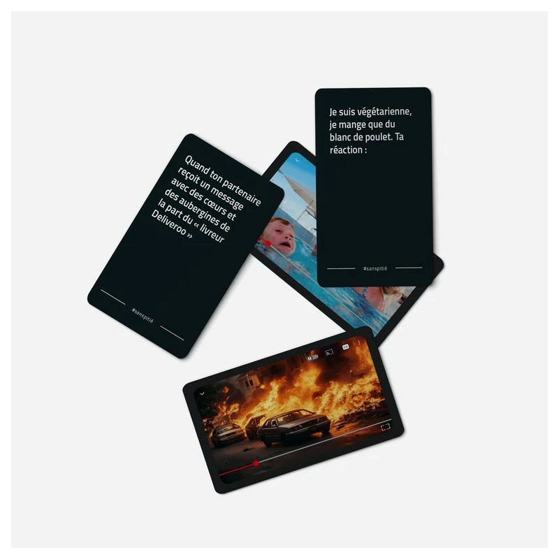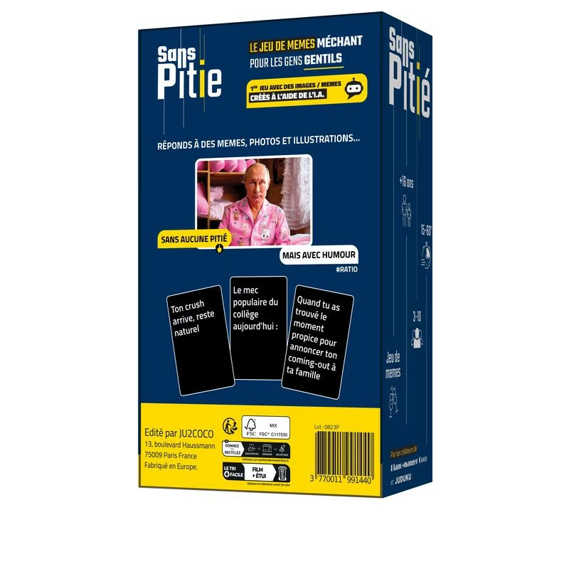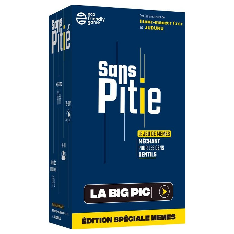 La Big Pic, c’est 600 nouvelles cartes sur le thème de memes créés à l’aide de l’Intelligence Artificielle et à partir de vraies images, où il ne va pas falloir hésiter à être créatif tout en étant Sans Pitié. Grâce à l’IA, la créativité est quasiment sans limite et vous allez découvrir de nouveaux memes inédits et insolites ! À partir d’une image, représentée par une carte « meme » posée par un joueur (le maître du jeu) les autres joueurs doivent choisir la réponse qui sera la plus à même de le faire rire. Le maître du jeu choisit donc la réponse qui lui plait le plus et son auteur marque un point et devient le maître du jeu pour le tour suivant. Le premier joueur qui marque 5 points gagne la partie.