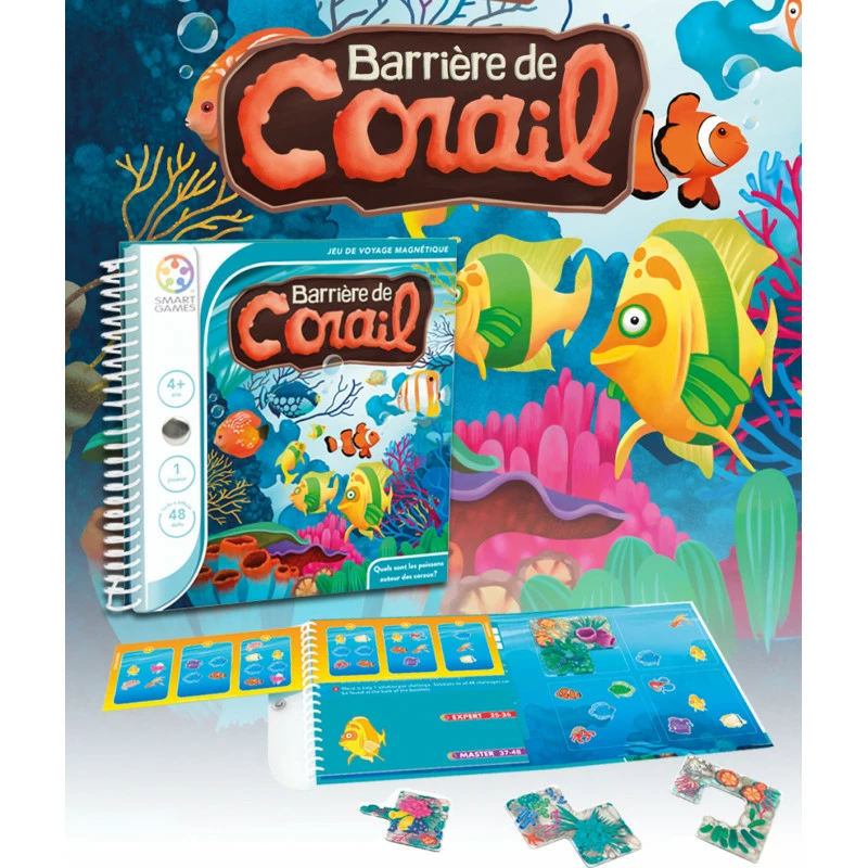 Placez les quatre tuiles aimantées «coraux» de manière à ne laisser visibles que les espèces marines indiquées dans le défi choisi. Barrière de corail est un jeu de réflexion pour toute la famille proposant 48 défis du plus simple au plus compliqué. Barrière de Corail est un jeu de voyage idéal !